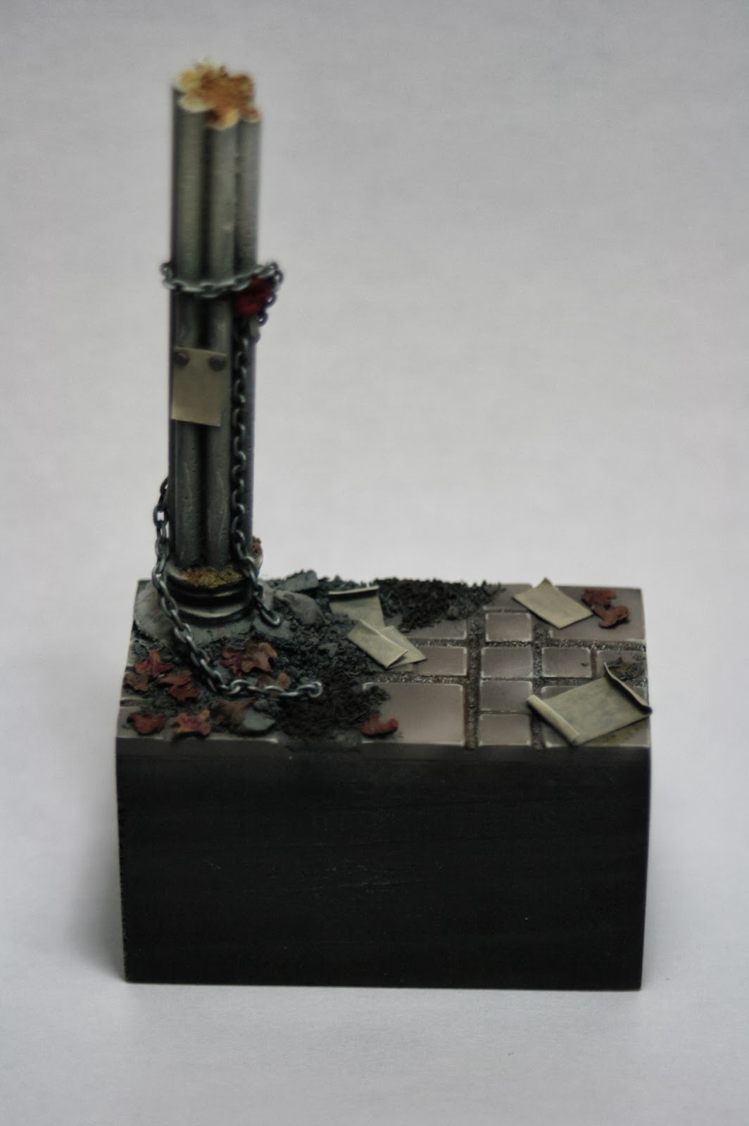 I wanted a desolate setting to contrast with the very serene look of the miniature. However I could not have the "desolation" overpower this figure, which is quite small as these things go... So I settled for a broken column, scattered parchments and dirt to create this feeling of a wrecked Scriptorium. Obviously there is still a bit of work to go...
