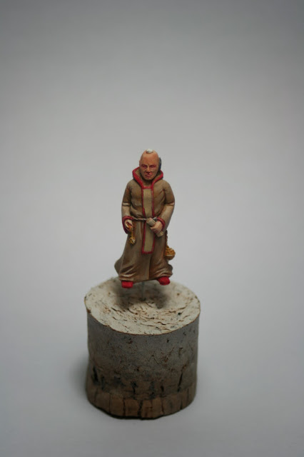 I wanted a desolate setting to contrast with the very serene look of the miniature. However I could not have the "desolation" overpower this figure, which is quite small as these things go... So I settled for a broken column, scattered parchments and dirt to create this feeling of a wrecked Scriptorium. Obviously there is still a bit of work to go...